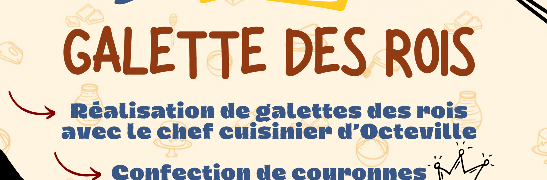 Du 24 Jan Biblio'Anim Galette des rois ! Animation cuisine Tarif : gratuit Timetable : 14h00 - 16h30 Adresse : Bibliothèque municipale Ajouter au calendrier Viens fabriquer ta galette des rois et une couronne !Moment de partage avec le chef cuisinier d'Octeville.Réservation au 02 35 54 62 95 ou bibliotheque@octevillesurmer.fr Sur la carto Bibliothèque municipale Fermer Precedent Retour à la liste Suivant